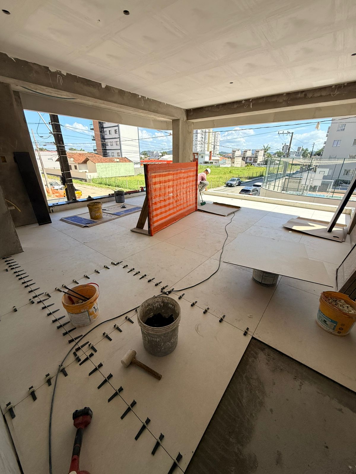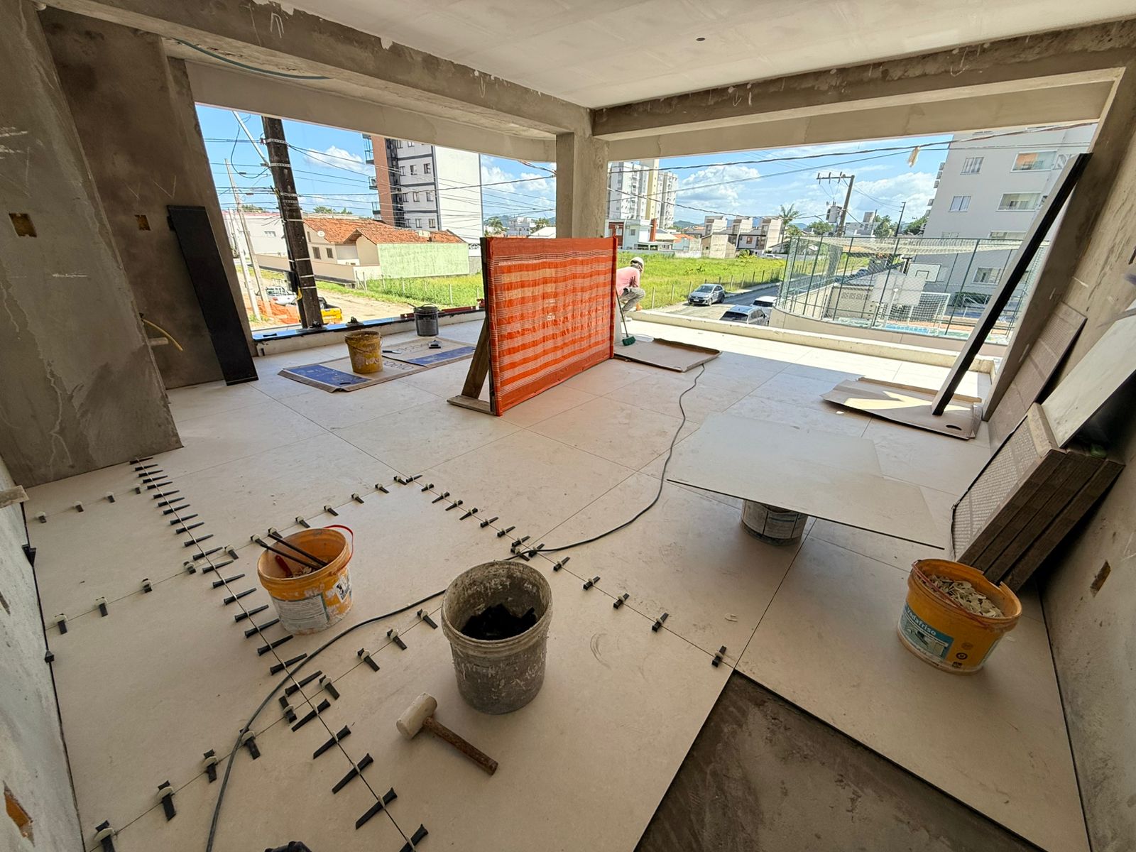 Porcelanato de grande formato nas áreas sociais e vinílico nas áreas íntimas