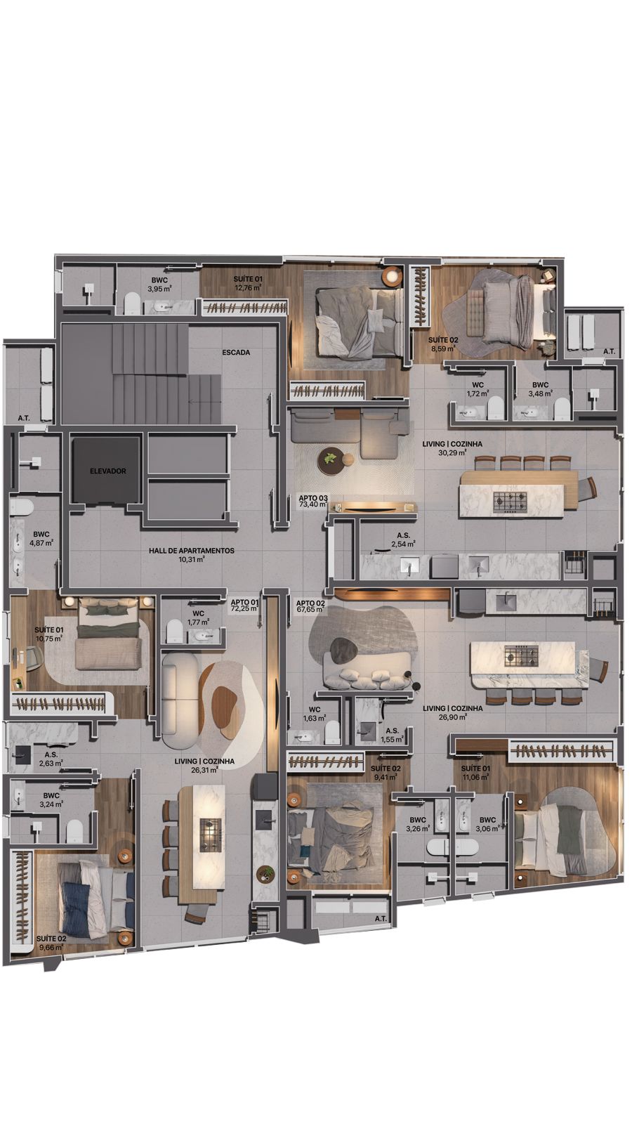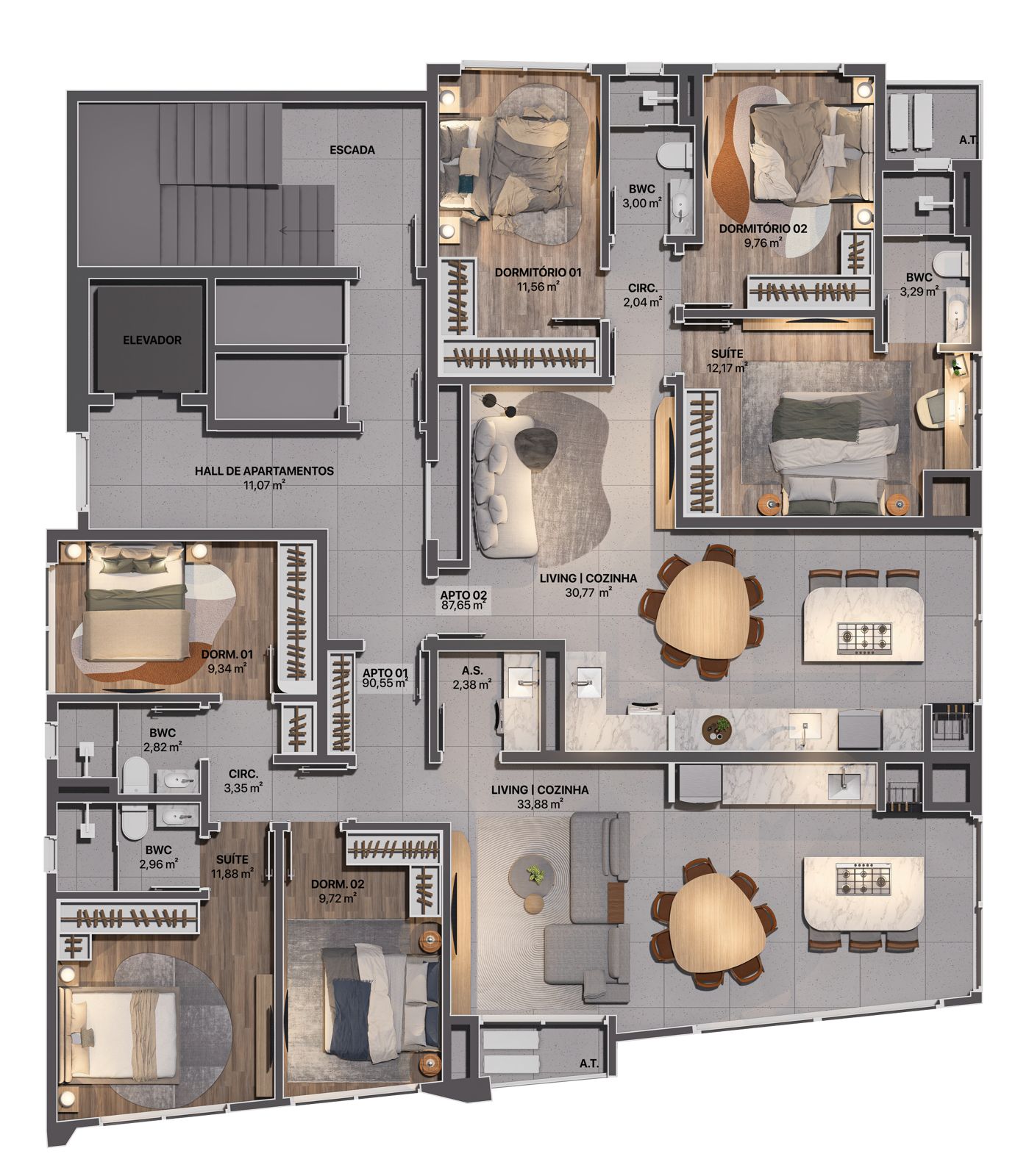 Unidades com 2 suítes ou 3 quartos, sendo uma suíte